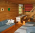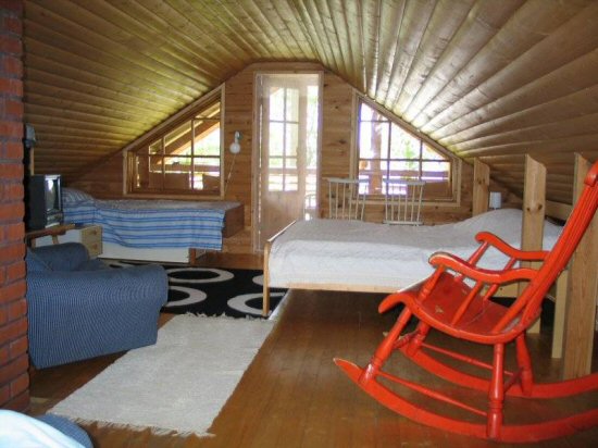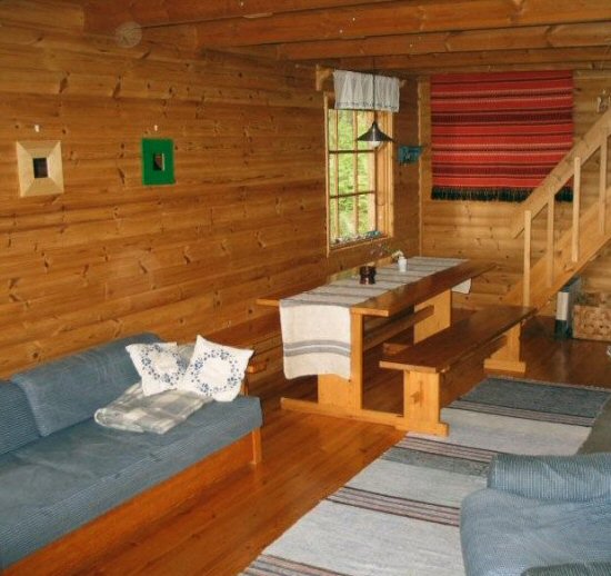 sauna, sekä olohuone vuodesohvilla. Yläkerrassa on